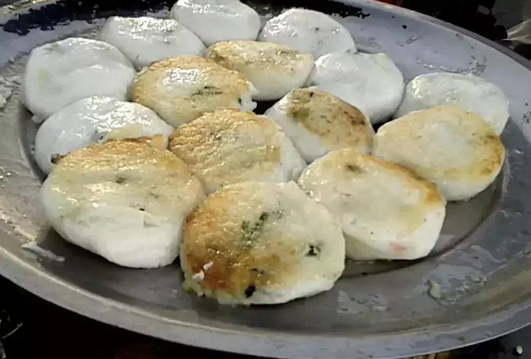 • Nom Kamchay is a popular Cambodian snack made from glutinous rice flour mixed with chopped Chinese chives. These small, savory cakes are steamed until soft and chewy, then pan-fried for a crispy outer layer. Often served with a sweet and tangy soy-vinegar dipping sauce, Nom Kamchay is enjoyed for its rich, garlicky aroma and satisfying texture. It’s a favorite street food in Cambodia, commonly eaten as a light meal or afternoon snack.